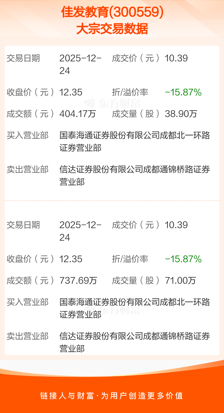 2025年12月24日,佳发教育发生2笔大宗交易,共成交109.90万股,成交金额1141.86万元,占其流通市值比例为0.30%。