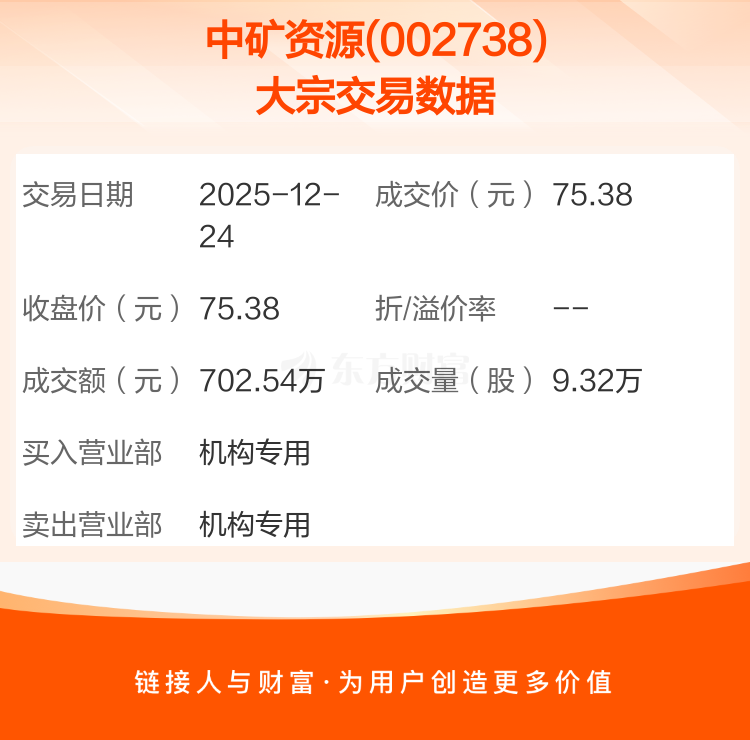 2025年12月24日,中矿资源发生1笔大宗交易,共成交9.32万股,成交金额702.54万元,占其流通市值比例为0.01%。