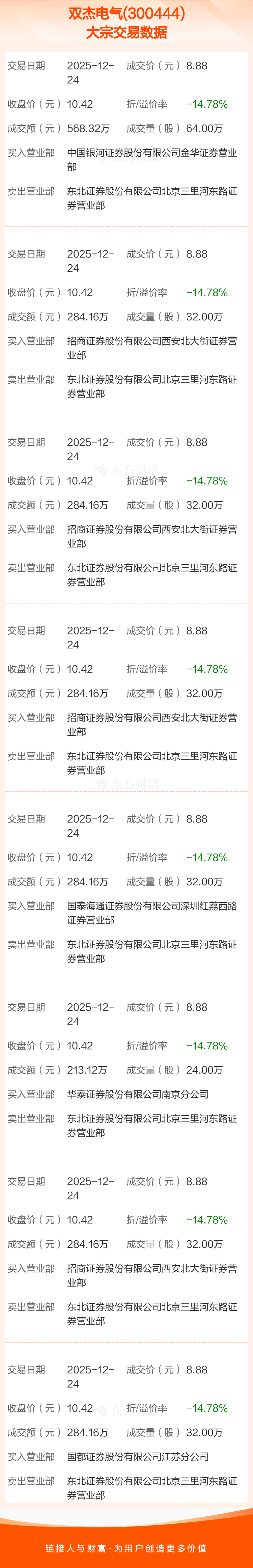 2025年12月24日,双杰电气发生8笔大宗交易,共成交280.00万股,成交金额2486.40万元,占其流通市值比例为0.38%。