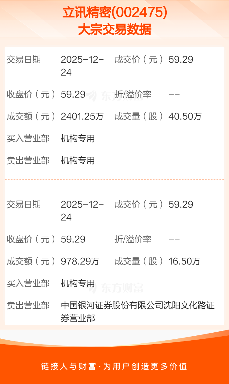 2025年12月24日,立讯精密发生2笔大宗交易,共成交57.00万股,成交金额3379.54万元。