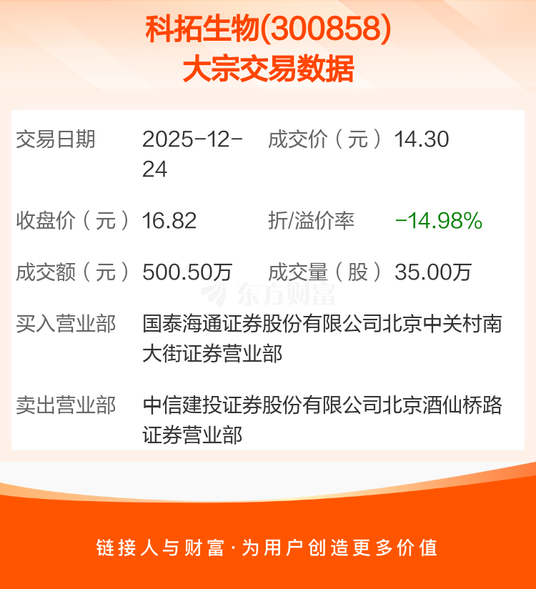 2025年12月24日,科拓生物发生1笔大宗交易,共成交35.00万股,成交金额500.50万元,占其流通市值比例为0.15%。