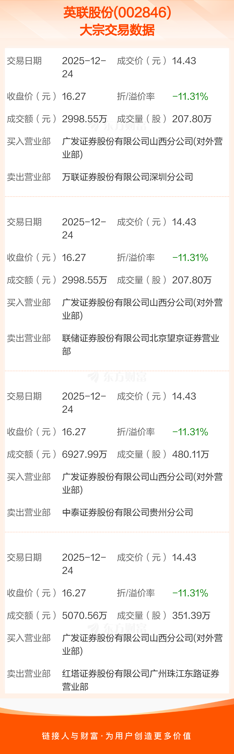 2025年12月24日,英联股份发生4笔大宗交易,共成交1247.10万股,成交金额1.80亿元,占其流通市值比例为4.30%。