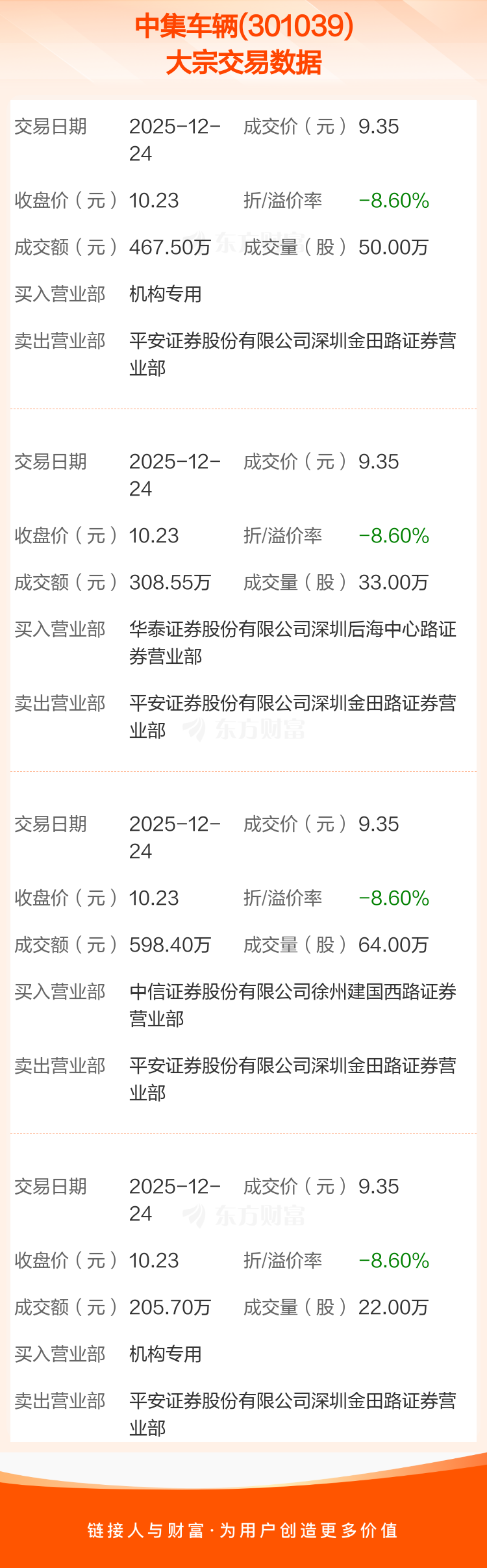2025年12月24日,中集车辆发生4笔大宗交易,共成交169.00万股,成交金额1580.15万元,占其流通市值比例为0.11%。