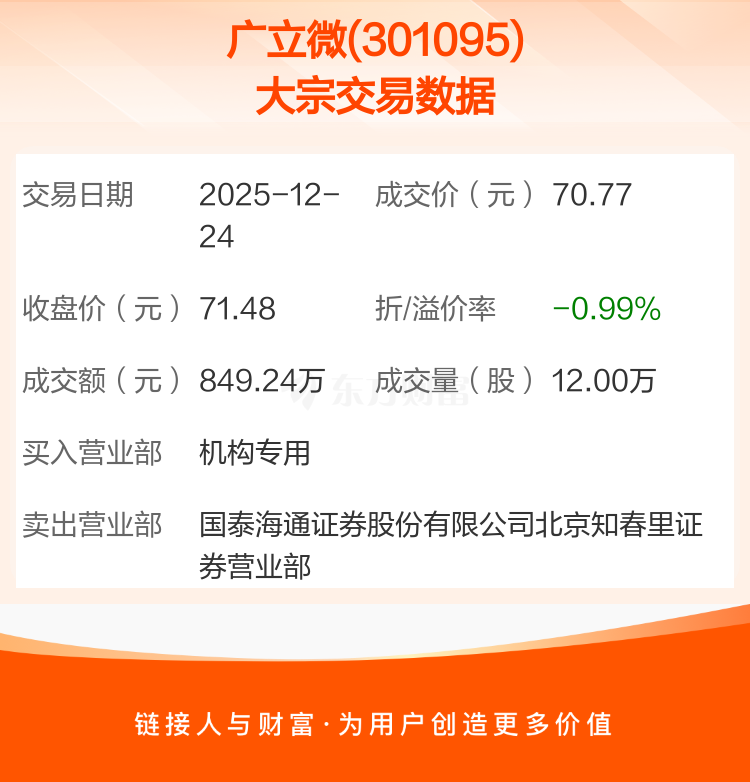 该笔大宗交易成交均价70.77元,较该股当日收盘价71.48元折价0.99%。