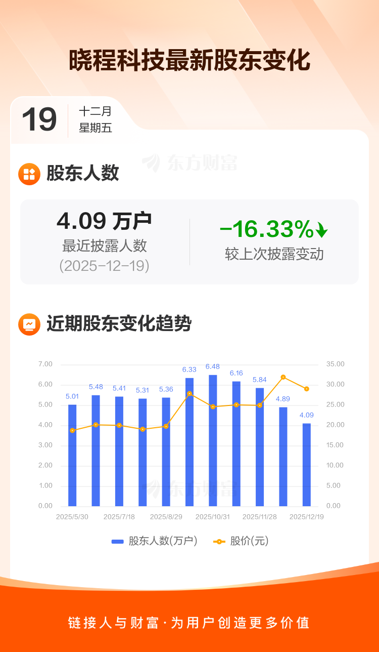晓程科技最新披露数据显示,截至12月19日公司股东户数为4.09万户,较上期(2025年12月10日)减少7982户,降幅为16.33%。户均持有流通股数量由上期的4780股上升至5713股,户均持股金额由上期的15.23万元增加至16.55万元。