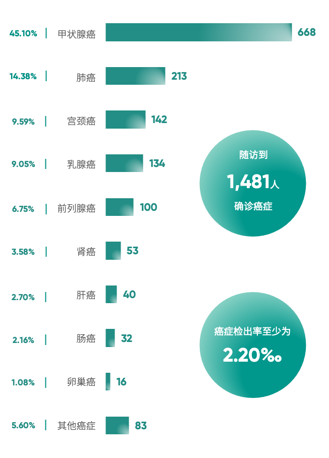 《上海健康报告》显示,在随访到的1481例确诊癌症中,甲状腺癌确诊人数最多,达668人,其次是肺癌、宫颈癌、乳腺癌和前列腺癌。