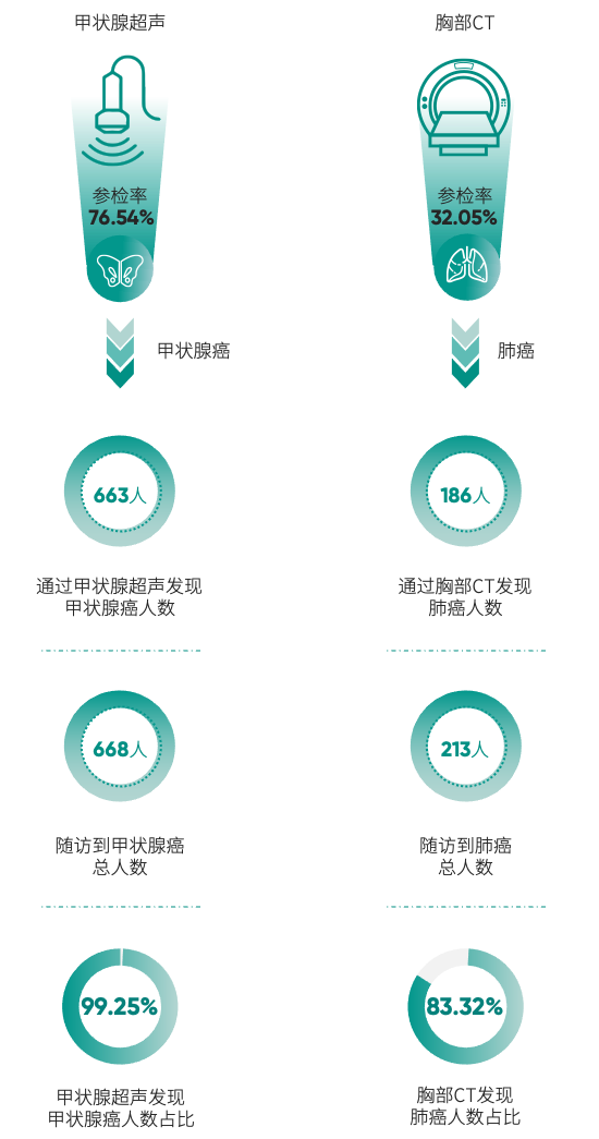 “能否发现,取决于癌症所处的发展阶段,以及体检筛查的方法与手段。”张黎刚给出了直接答案,“在上海,76.54%的体检者会做甲状腺超声,而做胸部CT的只有32.05%。如果提高低剂量螺旋CT的参检率,肺癌的早期发现率会大幅提升。”