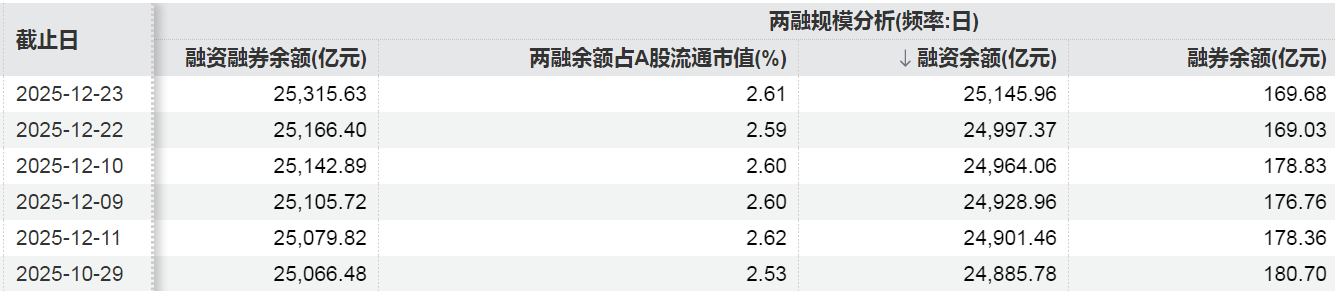 Wind数据显示,截至12月23日,A股市场两融余额报25315.63亿元,融资余额报25145.96亿元,融券余额为169.68亿元。其中两融余额和融资余额均再创历史新高,融资余额较前一交易日增加148.59亿元,为历史首次站上2.5万亿元。