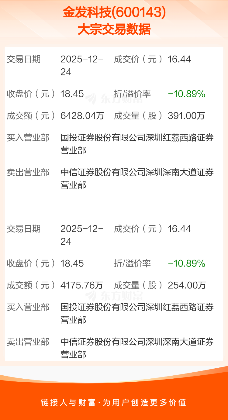 2025年12月24日,金发科技发生2笔大宗交易,共成交645.00万股,成交金额1.06亿元,占其流通市值比例为0.22%。