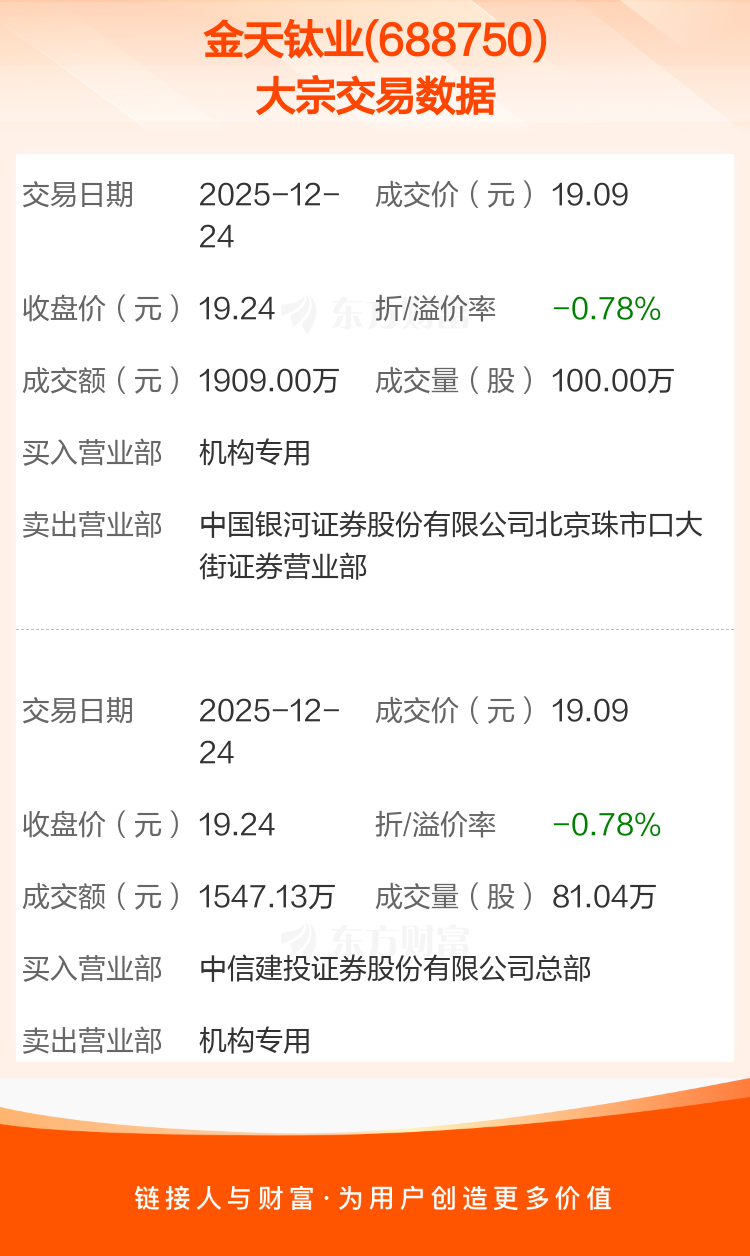 2025年12月24日,金天钛业发生2笔大宗交易,共成交181.04万股,成交金额3456.13万元,占其流通市值比例为0.77%。