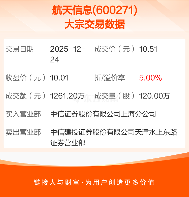 2025年12月24日,航天信息发生1笔大宗交易,共成交120.00万股,成交金额1261.20万元,占其流通市值比例为0.07%。