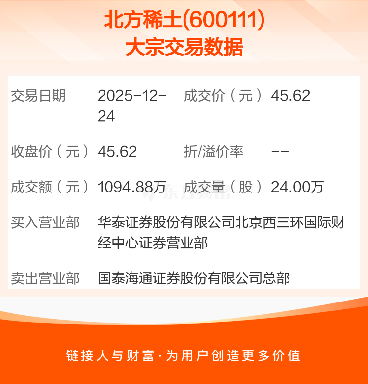 2025年12月24日,北方稀土发生1笔大宗交易,共成交24.00万股,成交金额1094.88万元。