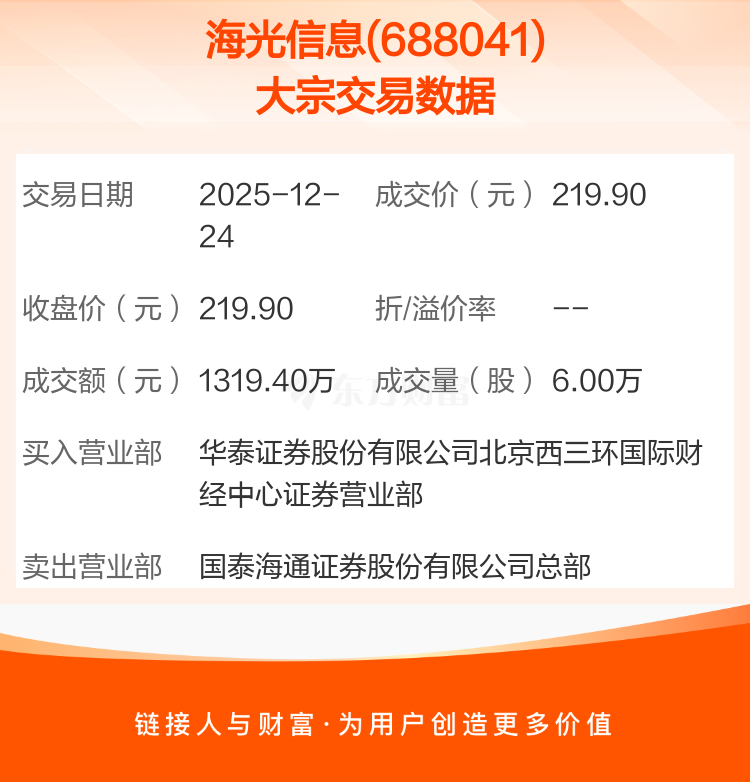 2025年12月24日,海光信息发生1笔大宗交易,共成交6.00万股,成交金额1319.40万元。