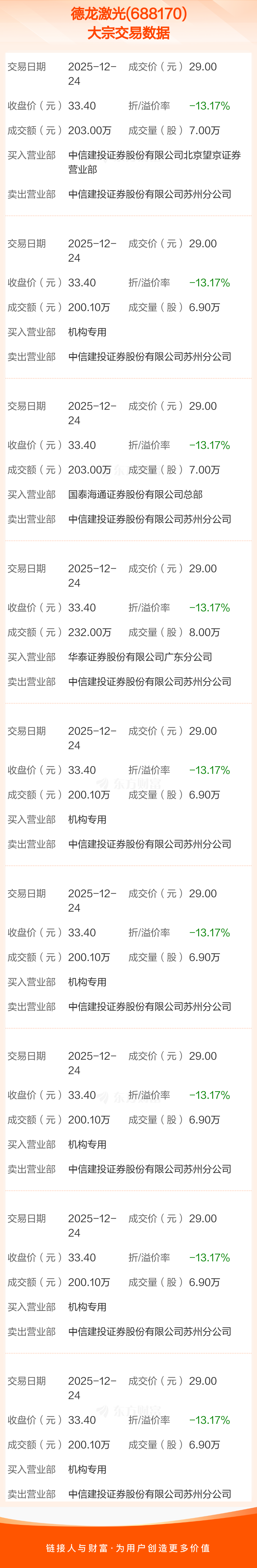 大宗交易:德龙激光成交1838.60万元,折价13.17%(12-24)