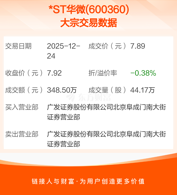 2025年12月24日,*ST华微发生1笔大宗交易,共成交44.17万股,成交金额348.50万元,占其流通市值比例为0.05%。