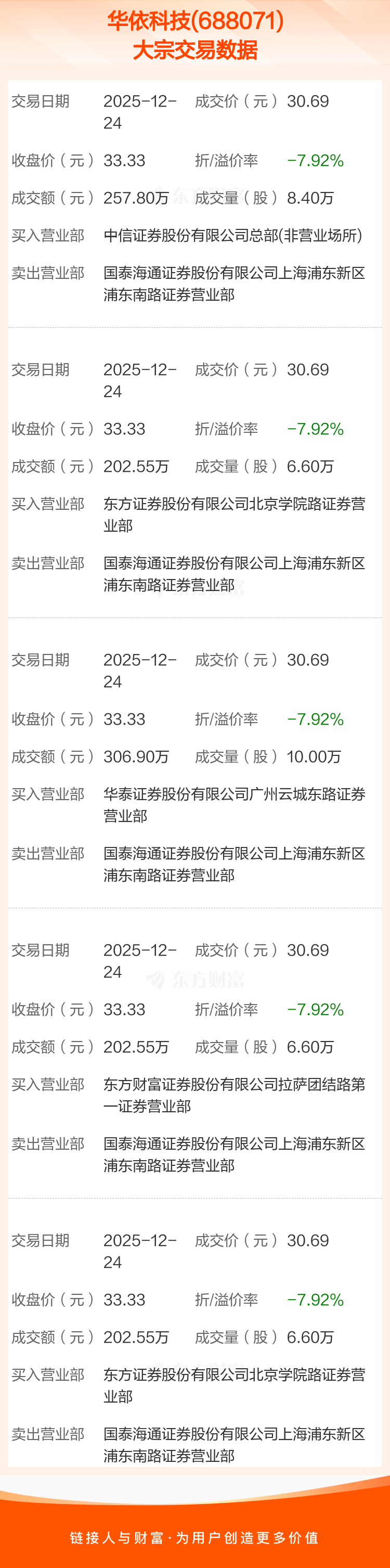2025年12月24日,华依科技发生5笔大宗交易,共成交38.20万股,成交金额1172.35万元,占其流通市值比例为0.41%。