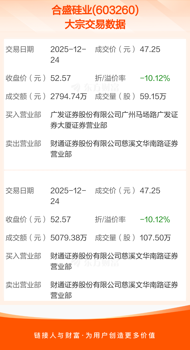 2025年12月24日,合盛硅业发生2笔大宗交易,共成交166.65万股,成交金额7874.12万元,占其流通市值比例为0.13%。