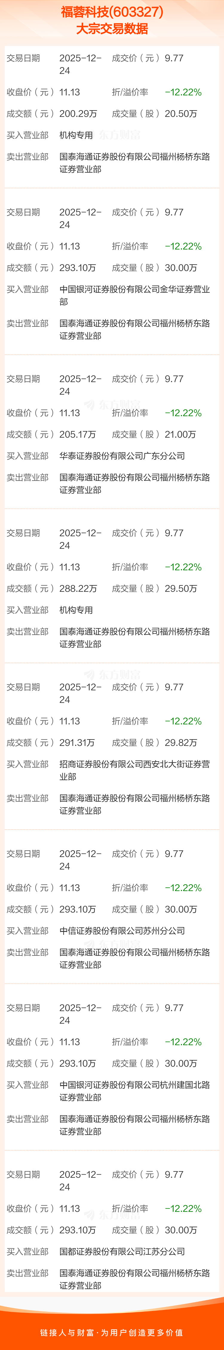 2025年12月24日,福蓉科技发生8笔大宗交易,共成交220.82万股,成交金额2157.39万元,占其流通市值比例为0.19%。