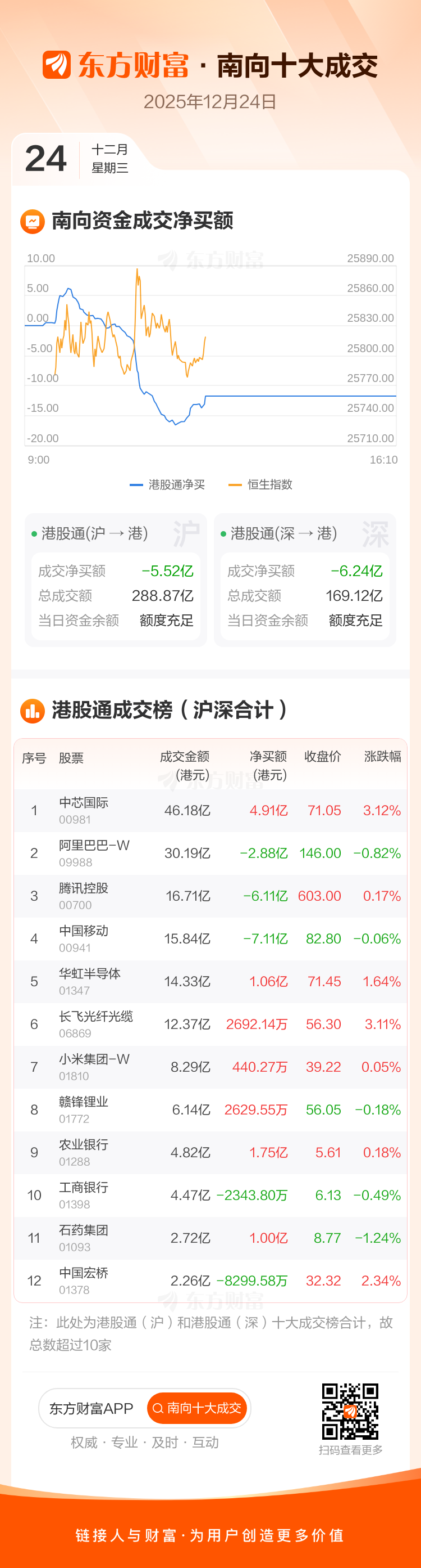 12月24日南向资金净卖逾11亿港元,逾4亿抢筹中芯国际