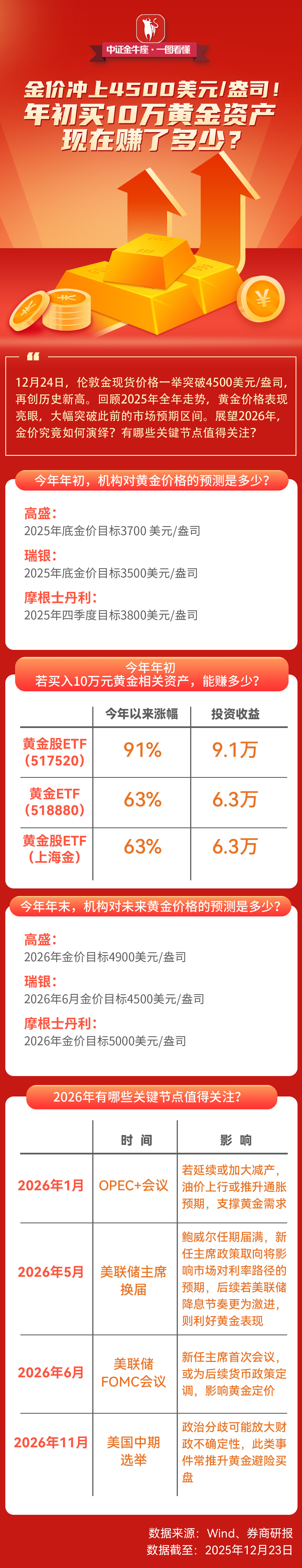【一图看懂】金价冲上4500美元/盎司!年初买10万元黄金资产 现在赚了多少?