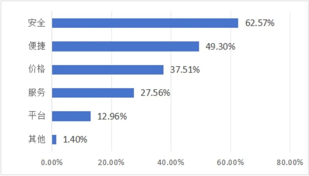 调查结果显示,62.57%受访者将安全作为选择网约车的首要关注因素,占比明显高于便捷性的49.30%和价格的37.51%。说明安全已成为超越便捷与价格的需求,是平台建立信任的核心基础。报告指出,近年来,网约车安全事件频发及相关法规完善,持续强化了消费者对出行安全的敏感度。消费者将安全置于首位,表明网约车消费已从“效率优先”进入“安全与效率并重”的阶段,平台在安全功能建设、驾驶员审核机制、行程保障等方面的投入与透明度,将成为影响消费者选择的关键因素。