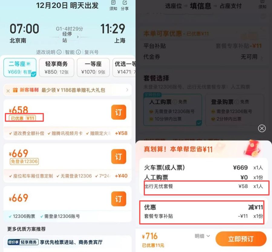 在另一在线旅游平台的小程序上,每经记者选择了相同时段北京至上海的火车票,订票页面显示最低票价为658元,其中用小字注明包含“11元优惠券”。但当记者点击进入付款页面后,最终结算总价却变为716元。