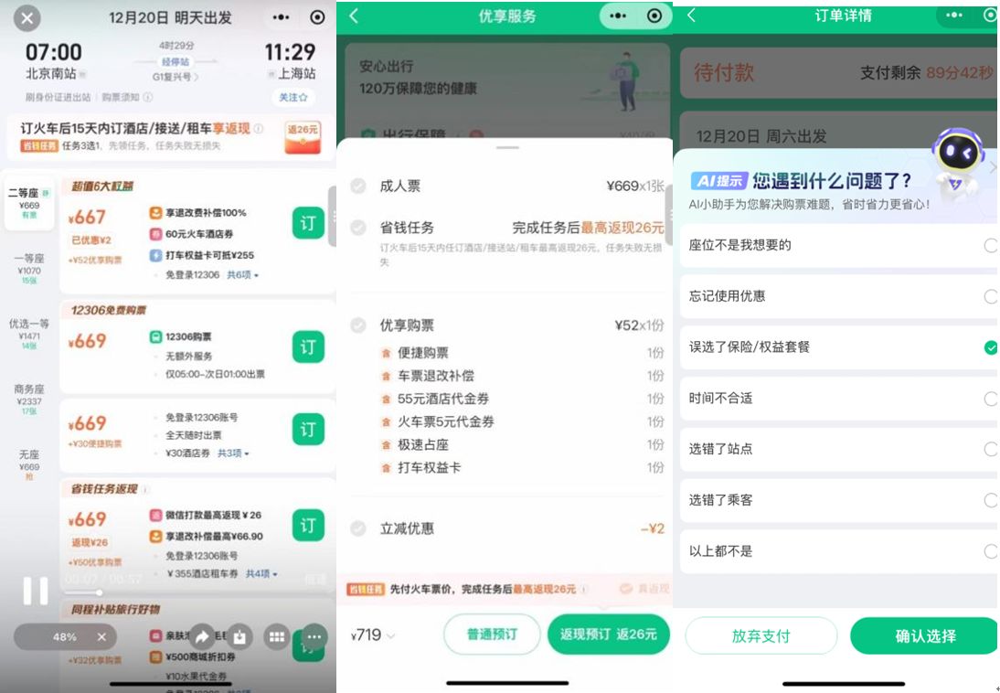 为验证此类界面设计是否存在行业普遍性,记者又选取另一在线旅游平台进行测试。在预订相同班次车票时,该平台首页同样将捆绑套餐的选项显示为最低票价。进入结算页面后,搭售产品也被默认添加至订单。记者尝试取消此次订票,但整个过程需依次点击“取消”、选择取消原因,再点击“确认选择”,方能完成操作。从进入平台开始购票到成功取消订票,整个流程耗时约5分钟。
