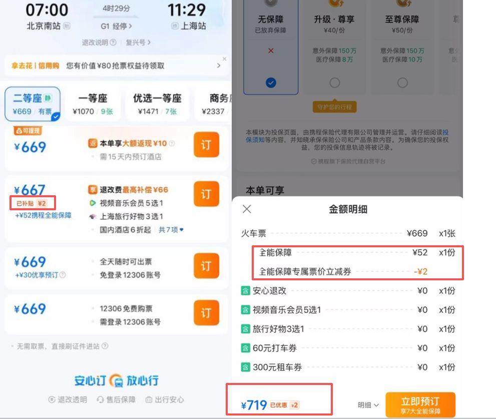 近日,记者通过某在线旅游App预订12月20日7时从北京至上海的火车票时发现,票务页面展示的最低价格为667元,并用更小的字体标注含有“2元补贴券”。然而,当点击进入订票页面后,系统显示总价自动跳转为719元。