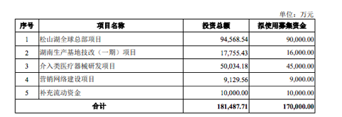 招股说明书(申报稿)显示,博迈医疗此次IPO拟募集资金17亿元,主要用于松山湖全球总部项目、湖南生产基地技改(一期)项目、介入类医疗器械研发项目、营销网络建设项目和补充流动资金。