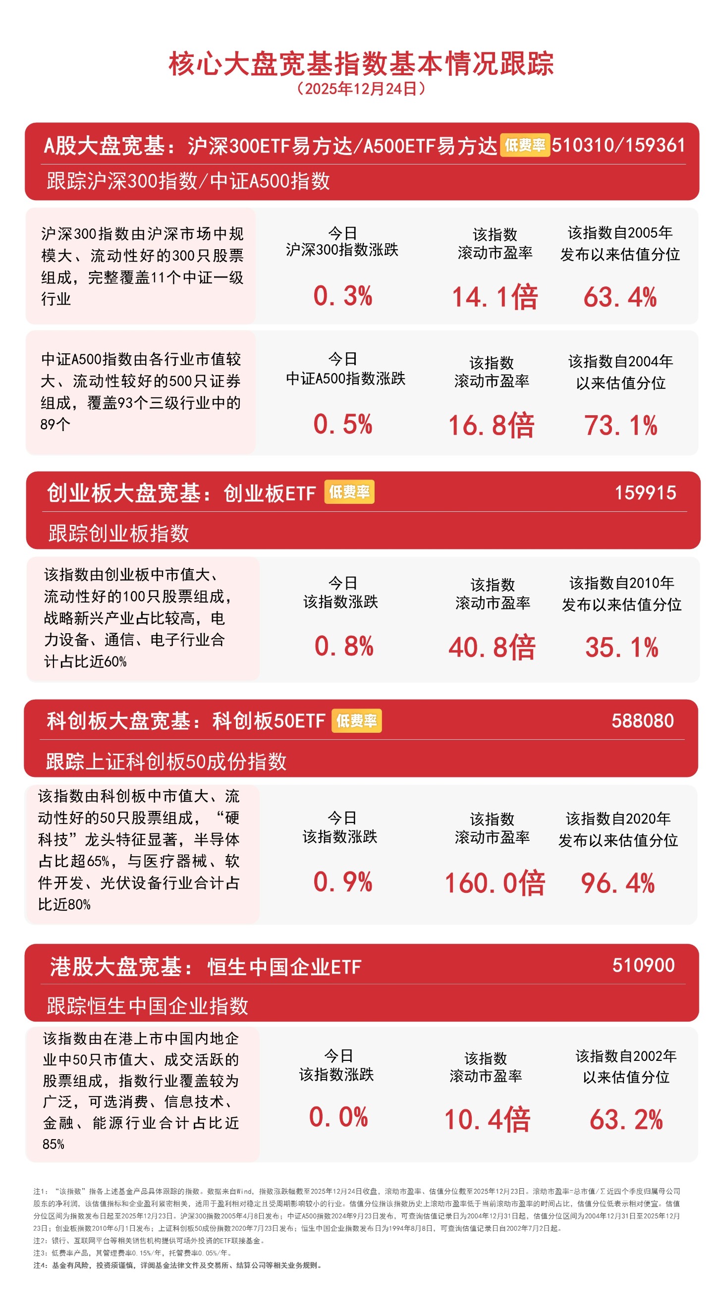 12月24日,市场震荡走强,上证指数高开高走实现六连阳,深证成指涨近1%,全市场成交额近1.9万亿元,超4100只个股上涨。盘面上,热点快速轮动,商业航天概念再度爆发,算力硬件股午后拉升;港股震荡,创新药板块延续调整。截至收盘,中证A500指数上涨0.5%,沪深300指数上涨0.3%,创业板指数上涨0.8%,上证科创板50成份指数上涨0.9%,恒生中国企业指数上涨0.01%。
