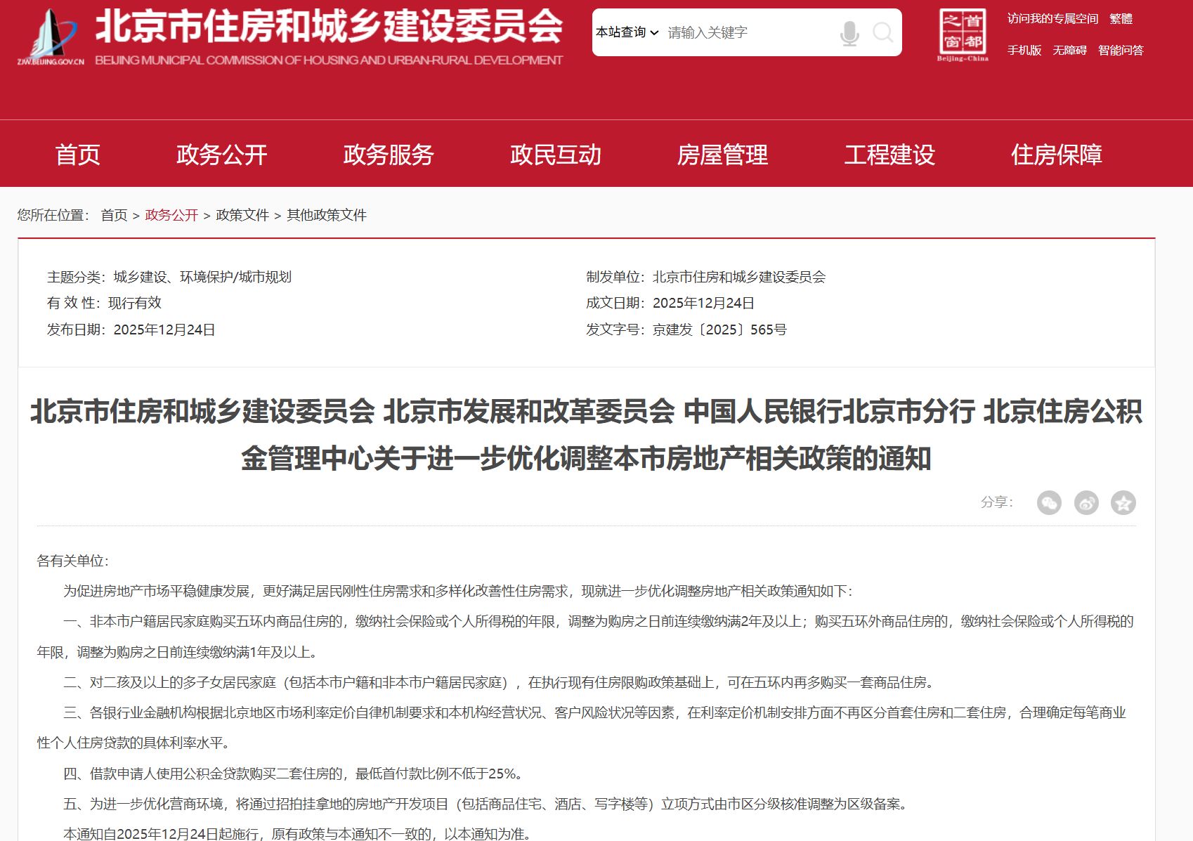 据北京市住房和城乡建设委员会官网,12月24日,北京市住房城乡建设委、市发展改革委、人民银行北京市分行、北京住房公积金管理中心等4部门联合印发《关于进一步优化调整本市房地产相关政策的通知》,自2025年12月24日起施行。