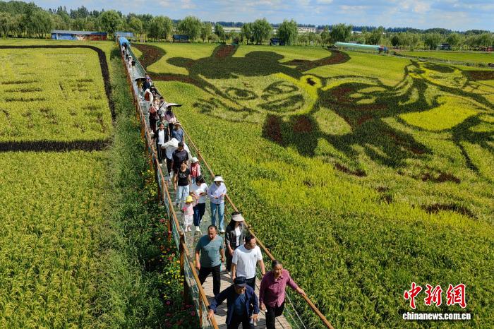 游客在宁夏稻渔空间乡村生态观光园观赏巨幅稻田画,感受“农业+文旅”深度融合的乡村振兴新图景。(资料图) 中新网记者李佩珊摄