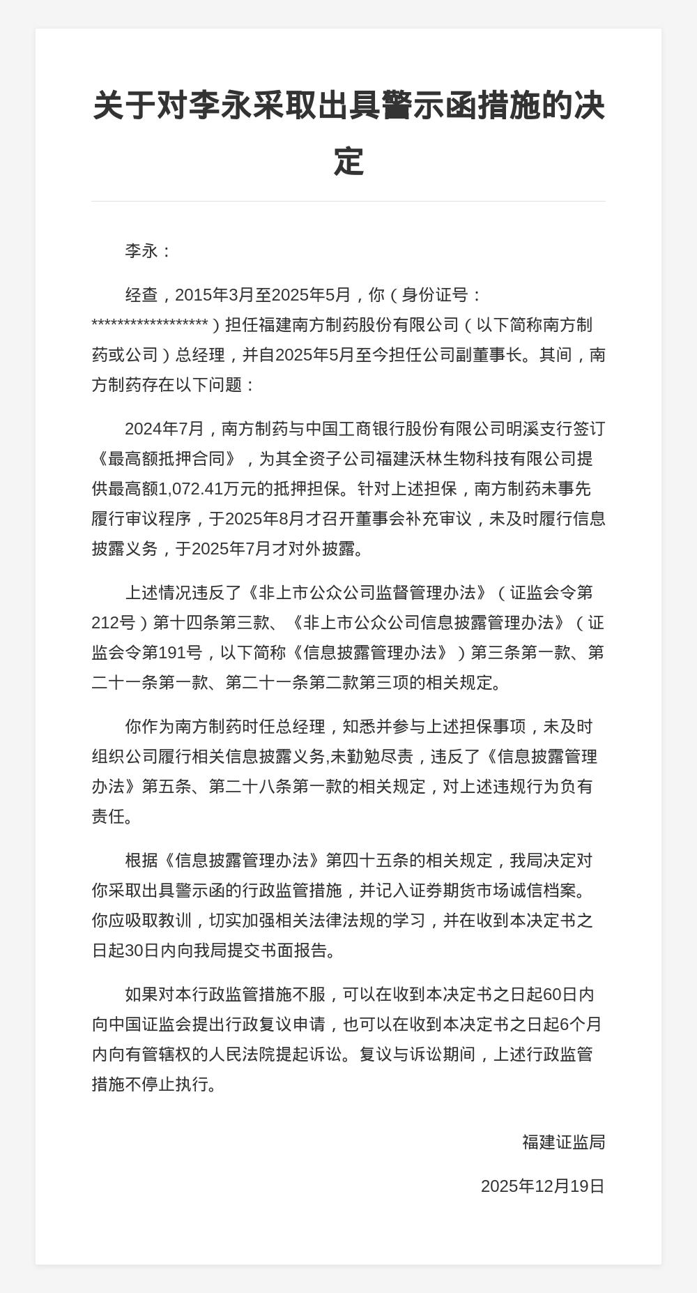 蓝鲸新闻12月24日讯,近日,福建证监局发布行政监管措施决定书,剑指福建南方制药股份有限公司及其相关责任人。