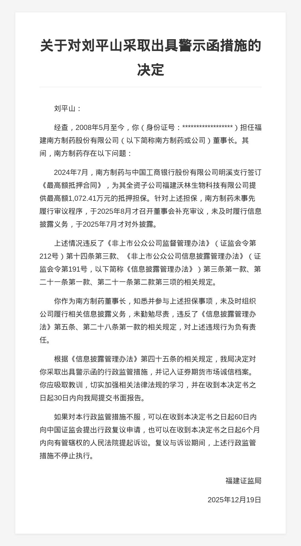 对此,福建证监局决定对福建南方制药股份有限公司、刘平山、李永、钟剑锋采取出具警示函的行政监管措施,并记入证券期货市场诚信档案。