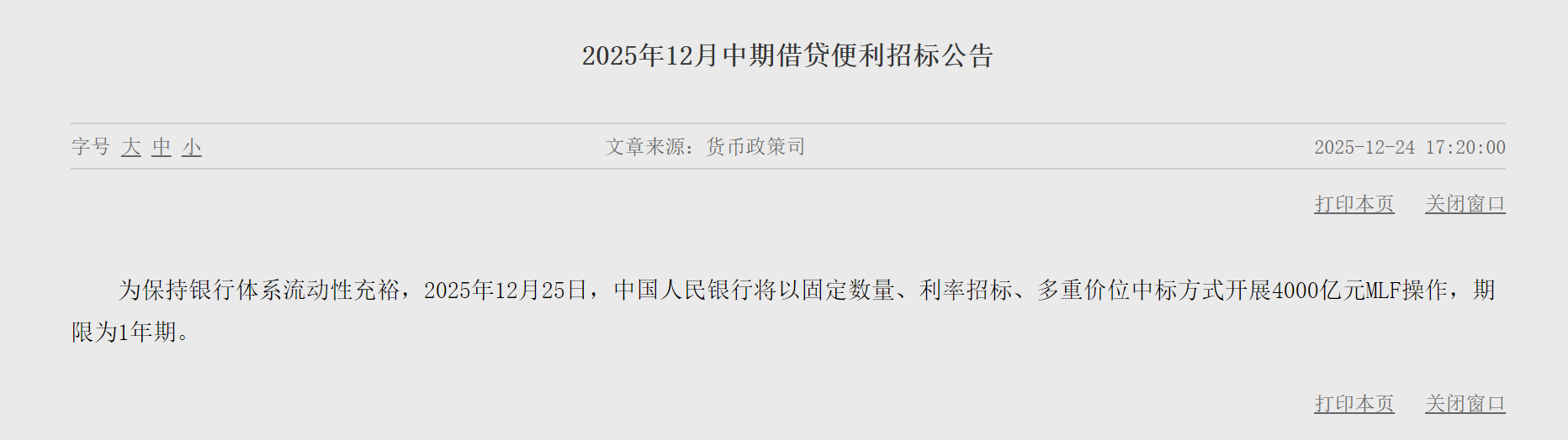 央广网北京12月24日消息(记者冯方)12月24日,央行发布公告称,为保持银行体系流动性充裕,将于12月25日以固定数量、利率招标、多重价位中标方式开展4000亿元中期借贷便利(MLF)操作,期限为1年期。