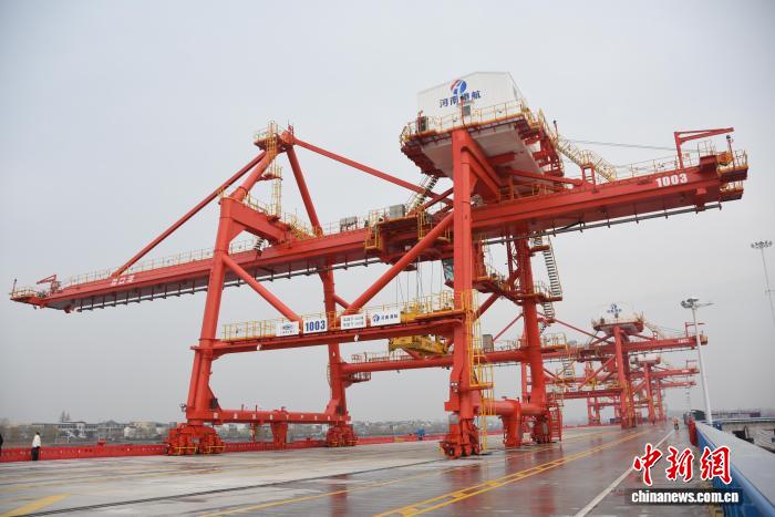 周口市港航管理局局长王程清介绍,一期项目建设13个泊位,设计年通过能力107.5万标箱。首期开港启用6个2000吨级集装箱泊位及堆场A区,设备投入3台自动化岸桥,6台自动化轨道吊,6台无人集卡等,年吞吐能力可达30万标箱。