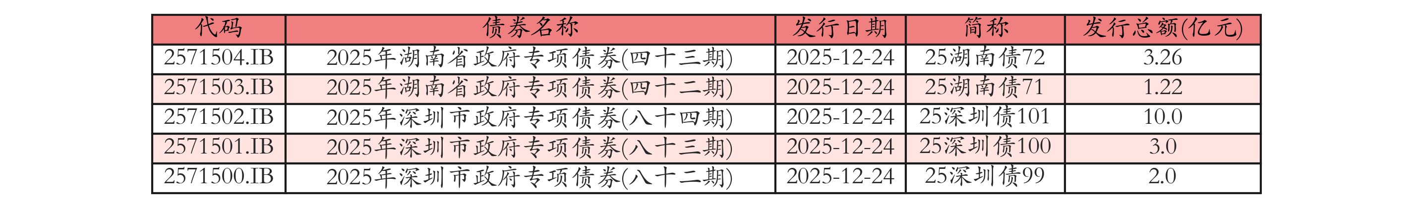 南财智讯12月24日电,南财金融终端数据显示,2025年12月24日全国共发行5只地方政府债,共计19.48亿元。其中,政府一般专项债发行0只,共0.0亿元;地方政府专项债发行5只,共19.48亿元。各地方政府所发行债券中,25深圳债101、25湖南债72发行规模靠前,发行金额分别为10.0亿元、3.26亿元。投标方面,各地方政府所发行债券中,25深圳债101、25湖南债72全场中标倍数靠前。其中:25深圳债101全场中标倍数为13.8,全场中标利率为2.42%,边际倍数为1.39;25湖南债72全场中标倍数为16.1,全场中标利率为1.83%,边际倍数为1.67。今日发行地方政府债详情如下表: