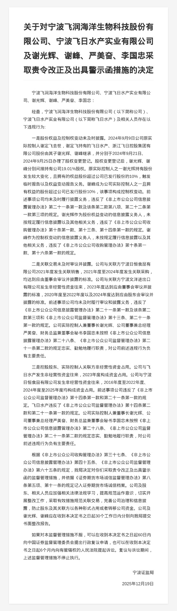 针对以上问题,宁波证监局决定对宁波飞润海洋生物科技股份有限公司、宁波飞日水产实业有限公司、谢光辉、谢峰、严美奋、李国忠采取责令改正及出具警示函的监督管理措施,并记入证券期货市场诚信档案。