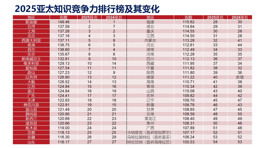 这份报告由上海市软科学基地上海市知识竞争力与区域发展研究中心(下称“知识竞争力研究中心”)和国际竞争力中心亚太分中心等联合研制,今年是它连续第16年发布。报告显示,新加坡蝉联亚太地区知识竞争力榜单首位,中国台湾与上海分列二、三,北京、西澳大利亚与香港位居四至六位。至此,中国有四个地区跻身亚太前十。