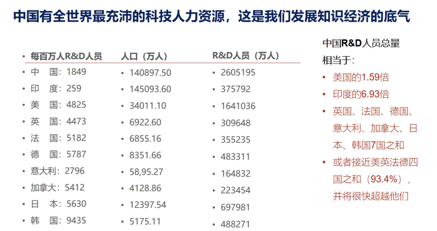 从人力资源看,中国R&D人员总量相当于美国的1.59倍、印度的6.93倍、英国、法国、德国、意大利、加拿大、日本、韩国7国之和;或者接近美英法德四国之和(93.4%),并将很快超越他们。