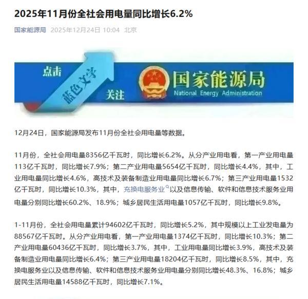 中国网财经12月24日讯国家能源局今日发布11月份全社会用电量等数据。