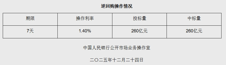 中新网12月24日电据央行网站消息,2025年12月24日中国人民银行以固定利率、数量招标方式开展了260亿元7天期逆回购操作。具体情况如下: