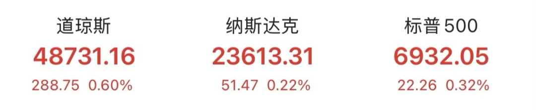 今年的平安夜,美股三大指数连涨五日,道指和标普再创收盘新高。截至收盘,道琼斯指数涨0.6%,报48731.16点,刷新了12月11日录得的收盘纪录;标普500指数涨0.32%,报6932.05点,连续第二日创收盘新高,此外还创下了6937.32点的盘中新高纪录;纳斯达克综合指数涨0.22%,报23613.31点。