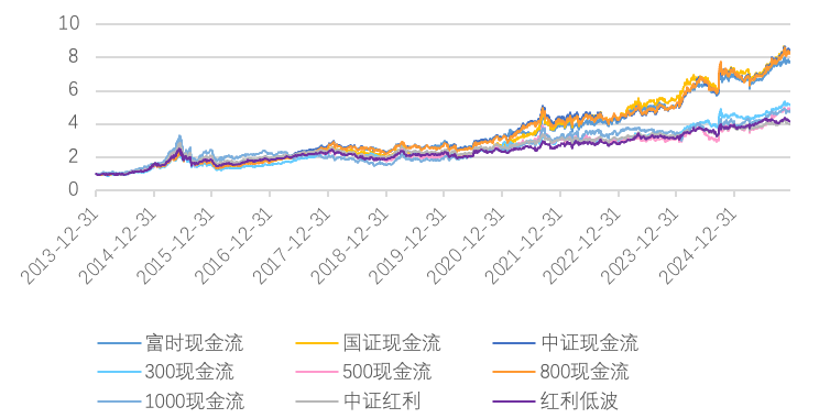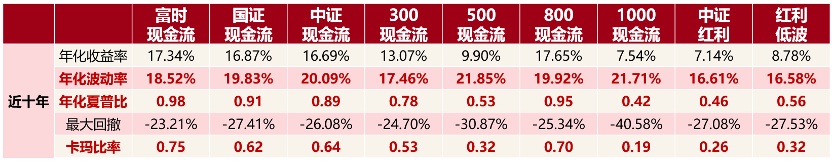 回顾2014年以来,富时现金流指数与国证现金流、中证现金流以及800现金流2014年以来总体表现接近,强于中证红利指数与红利低波指数。对比同类现金流指数走势,富时现金流指数的年化波动率相对较低、卡玛比率相对较高,具有较好的风险收益比。