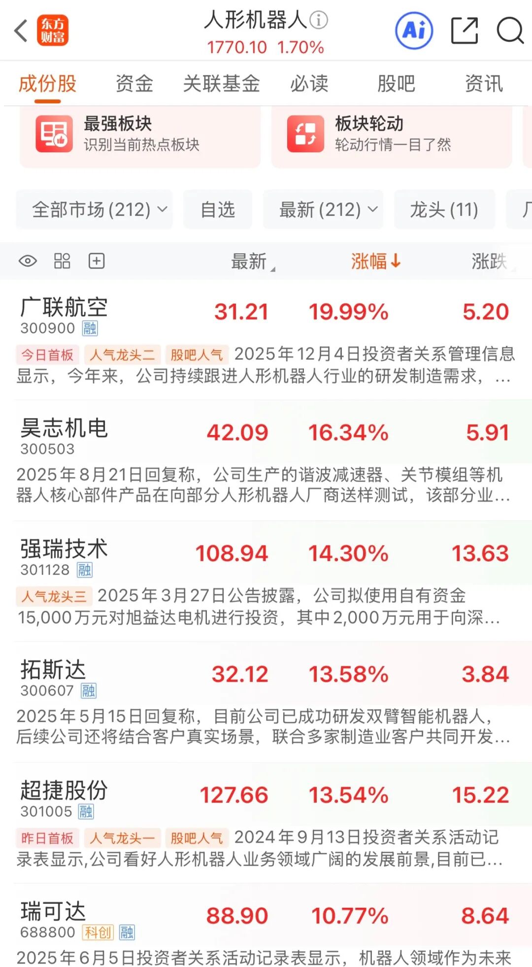12月25日早盘,人形机器人板块涨势凌厉,龙溪股份、天奇股份、瑞可达等多股涨停,昊志机电、拓斯达等跟涨。