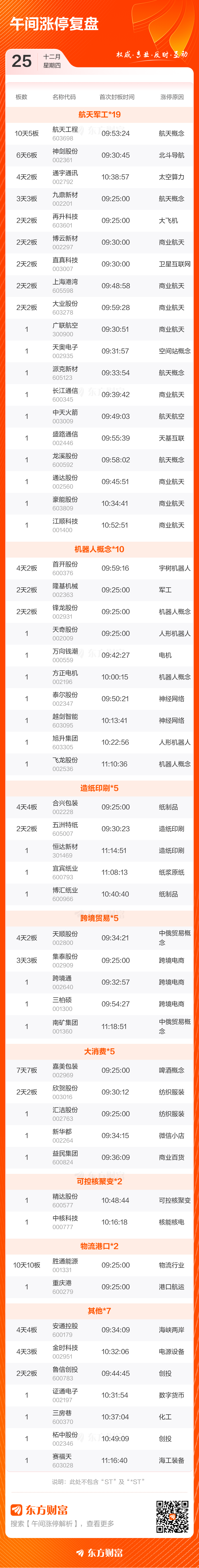 12月25日午间涨停复盘:69股涨停 航天工程10天5板