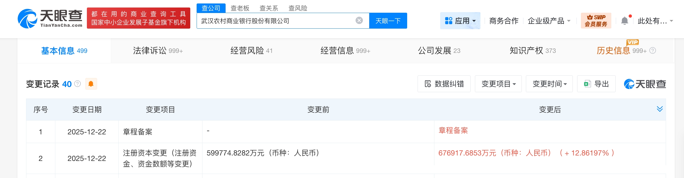 南方财经12月25日电,天眼查App显示,近日,武汉农村商业银行股份有限公司发生工商变更,注册资本由约59.98亿人民币增至约67.7亿人民币,增幅约13%。该公司成立于2009年8月,法定代表人为周玉萍,经营范围为经营中国银行业监督管理委员会依照有关法律、行政法规和其他规定批准的业务等,由武汉光谷金融控股集团有限公司、武汉国有资本投资运营集团有限公司、湖北香利资产管理有限公司等共同持股。
