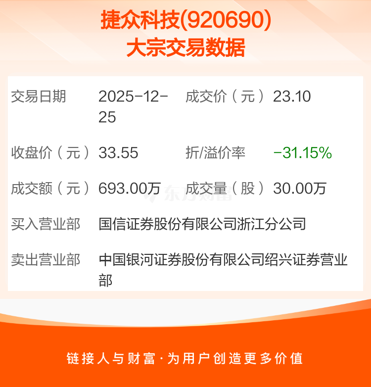 大宗交易:捷众科技成交693.00万元,折价31.15%(12-25)