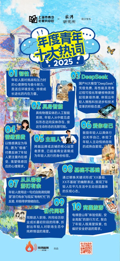 “2025年度青年十大热词”今天发布,分别是:韧性、具身智能、DeepSeek、情绪消费、主理人、爱你老己、从从容容游刃有余、基础不基础、初代同事、“窝囊”旅游。