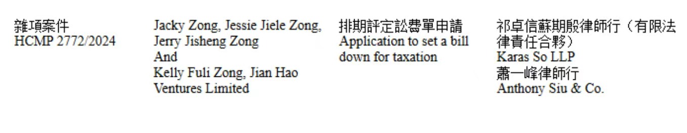 12月23日,界面新闻从香港特别行政区高等法院聆案官聆讯案件表查询获悉,当日香港高等法院审理涉“宗家三兄妹”和宗馥莉的一起案件。案件表披露,该案件属于杂项案件,诉讼各方分别为“宗家三兄妹”宗继昌、宗婕莉、宗继盛(Jacky, Jessie and Jerry Zong)以及宗馥莉和JIAN HAO VENTURES LIMITED(建浩创投有限公司),案件性质为排期评定讼费单申请。